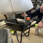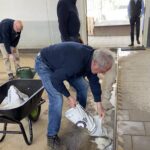 In de ochtend werd gestart met het verwijderen van het oude grind. Met kruiwagens en scheppen werd het materiaal naar buiten gebracht, waar het een nieuwe bestemming krijgt, op de buitenbanen en op de parkeerplaats. Een mooi voorbeeld van hergebruik en efficiënt werken.