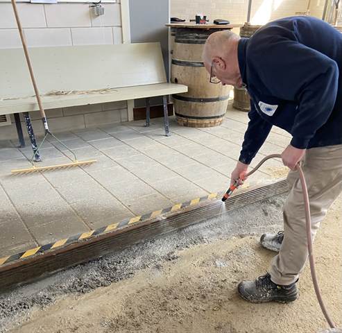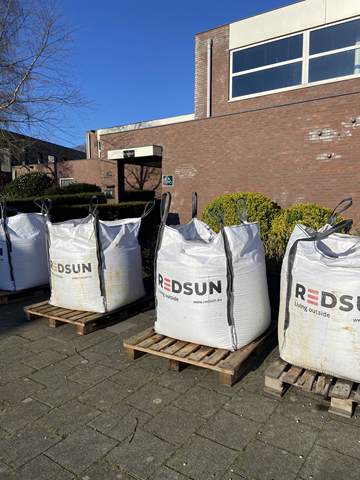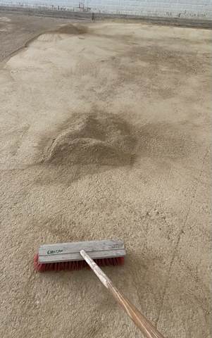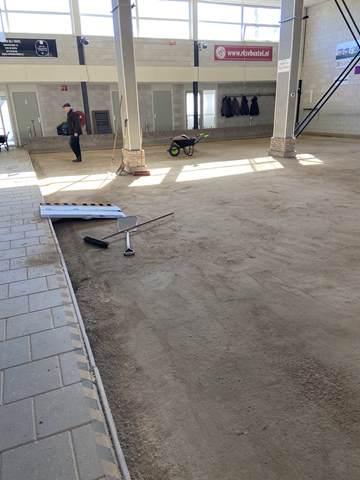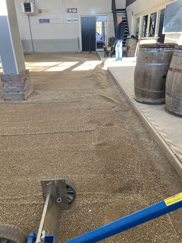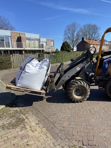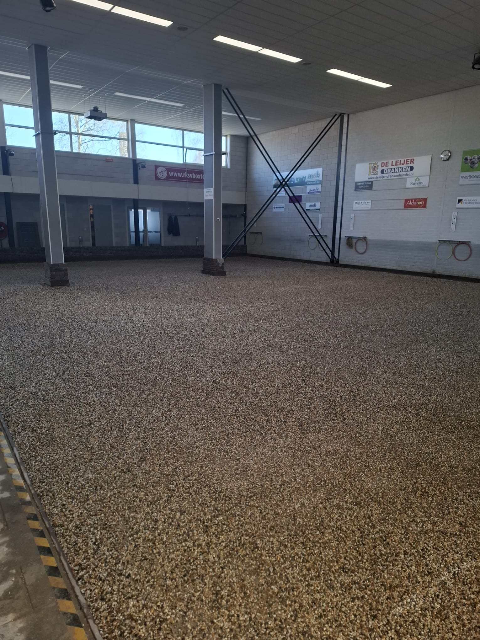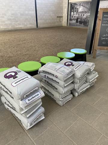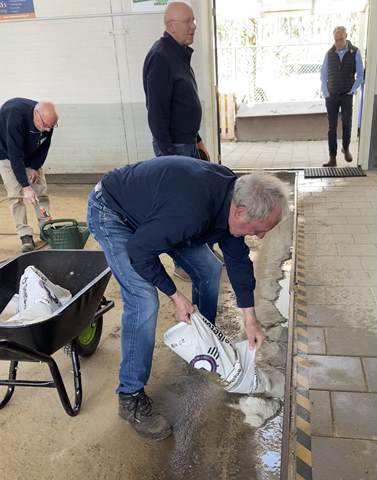 Binnen werden ondertussen de goten vakkundig dichtgemaakt met cement. Dit zorgt voor een strakke afwerking, veiligheid en duurzaamheid van de banen. Terwijl dit werk werd afgerond, stonden buiten de big bags met nieuw grind al klaar om naar binnen gebracht te worden.
