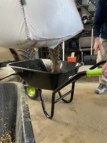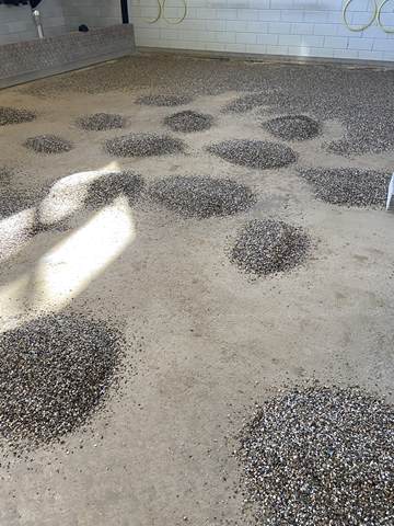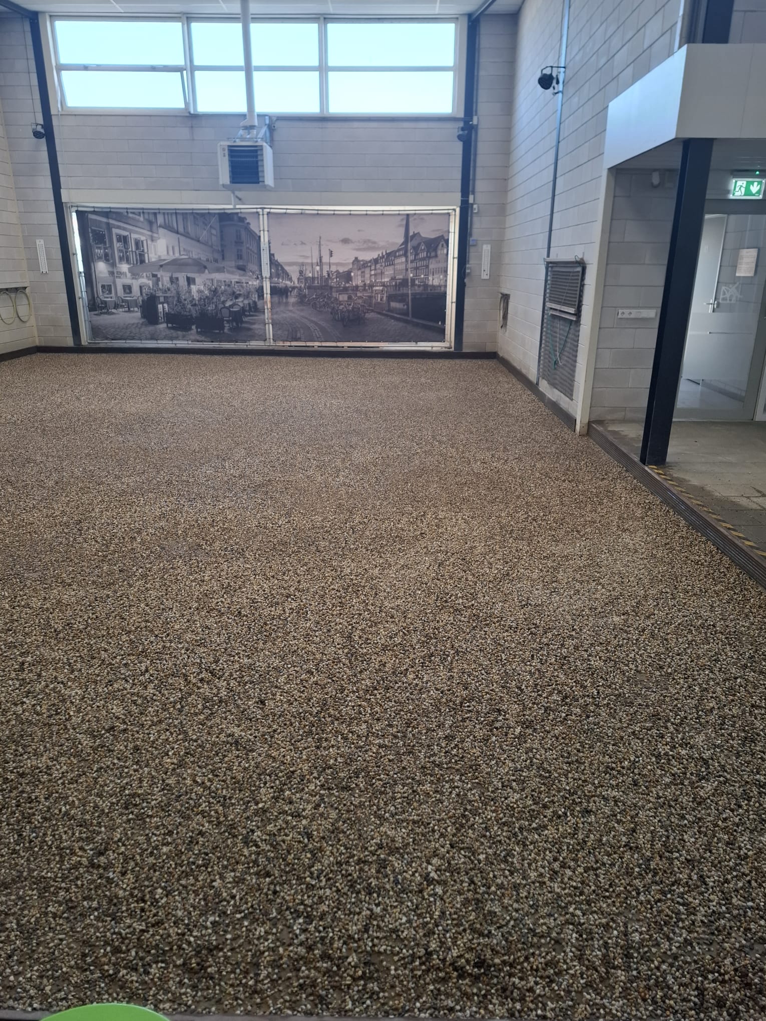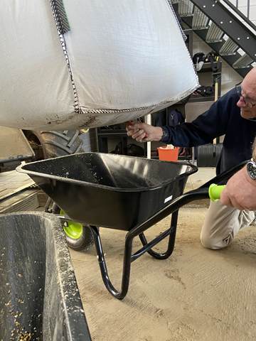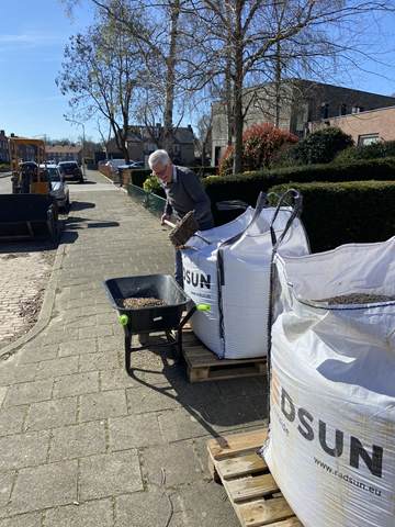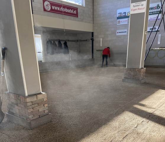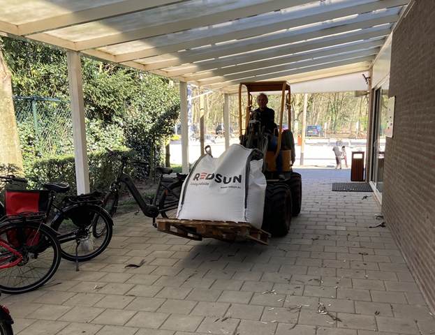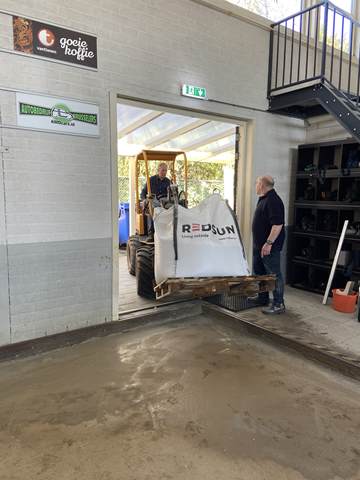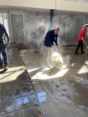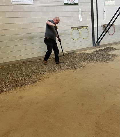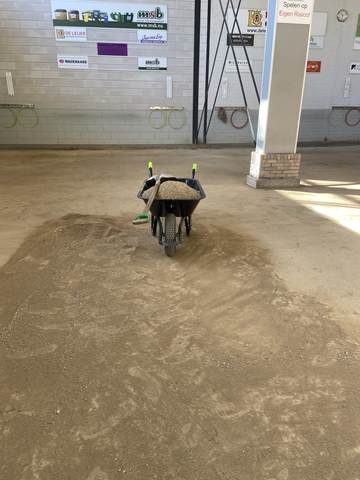In de ochtend werd gestart met het verwijderen van het oude grind. Met kruiwagens en scheppen werd het materiaal naar buiten gebracht, waar het een nieuwe bestemming krijgt, op de buitenbanen en op de parkeerplaats. Een mooi voorbeeld van hergebruik en efficiënt werken.
