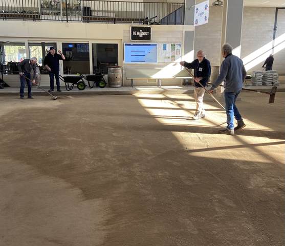 Vandaag stond volledig in het teken van onderhoud en samenwerking. Een enthousiaste groep vrijwilligers heeft zich ingezet om het grind van alle binnenbanen te vervangen – een flinke klus die dankzij de gezamenlijke inzet soepel is verlopen.